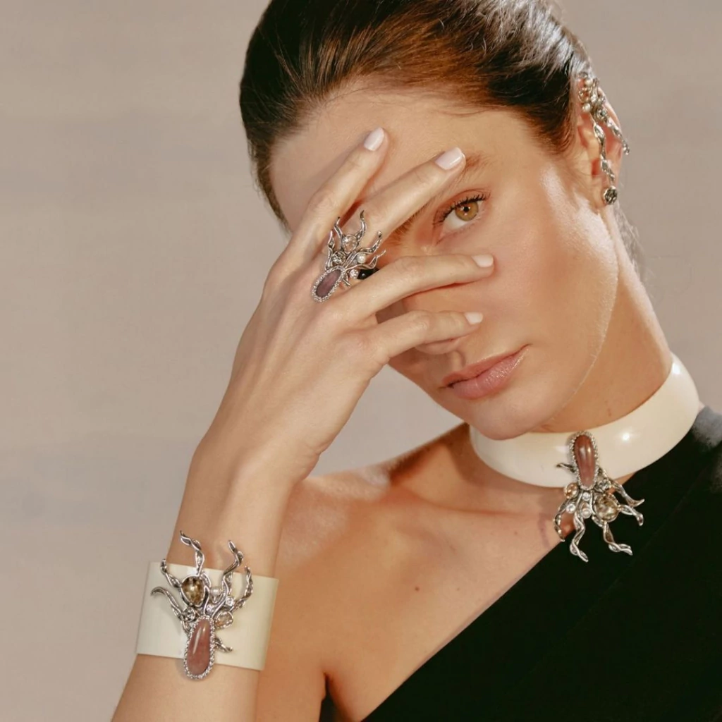 Materiais: Cristais, Pérola, Jaspe Cobra e metais com banho em ouro velho.