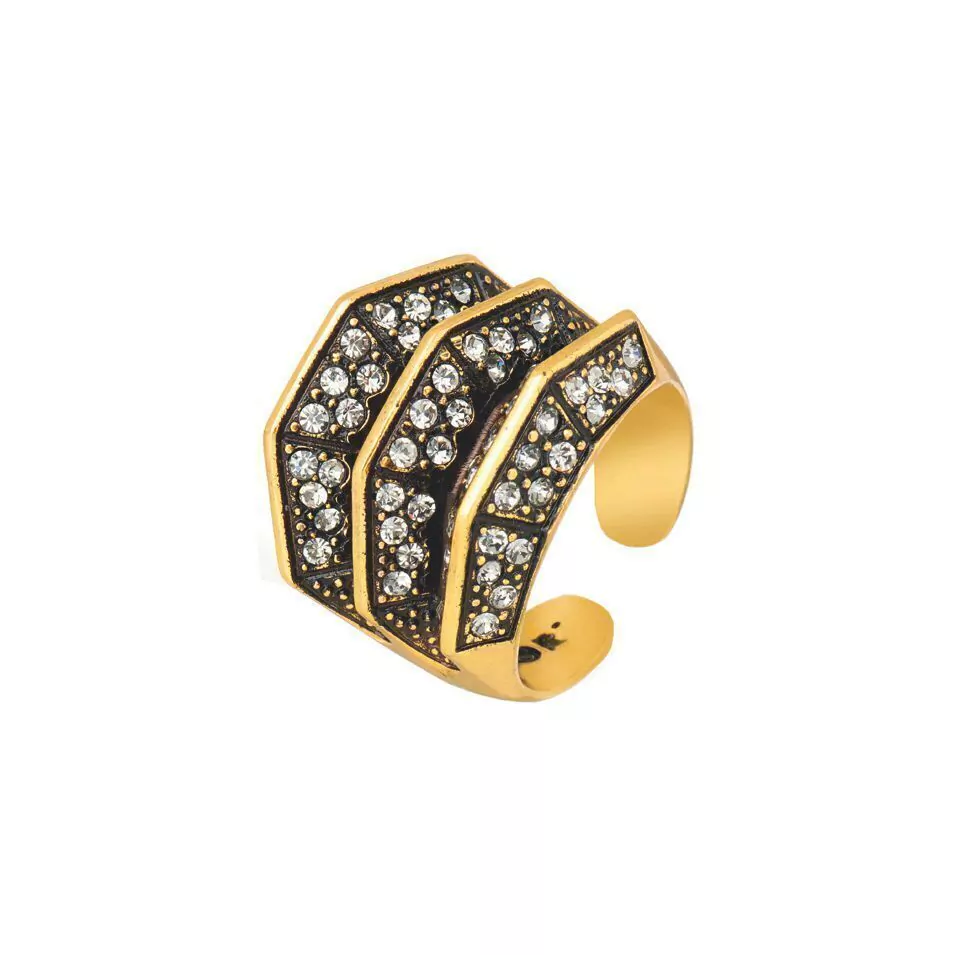 O Anel Maxi Strass Labirinto foi produzido artesanalmente, aplicando as técnicas da joalheria, no banho Ouro Vintage, com cristais cravejados manualmente.