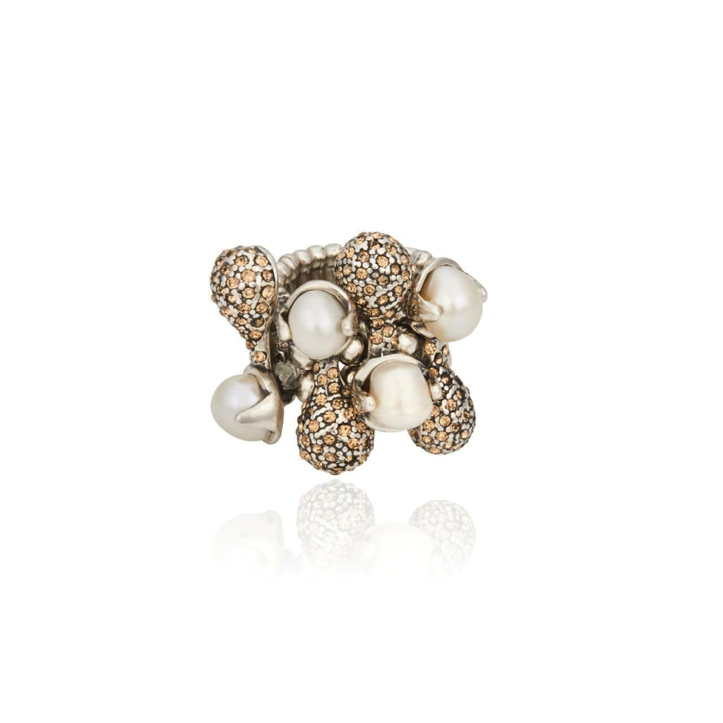 Cristais em tons de roxo, rosé e cinza se unem a pérolas brancas e aos banhos ouro velho e prata velho, criando composições sofisticadas que combinam textura, brilho e elegância atemporal.