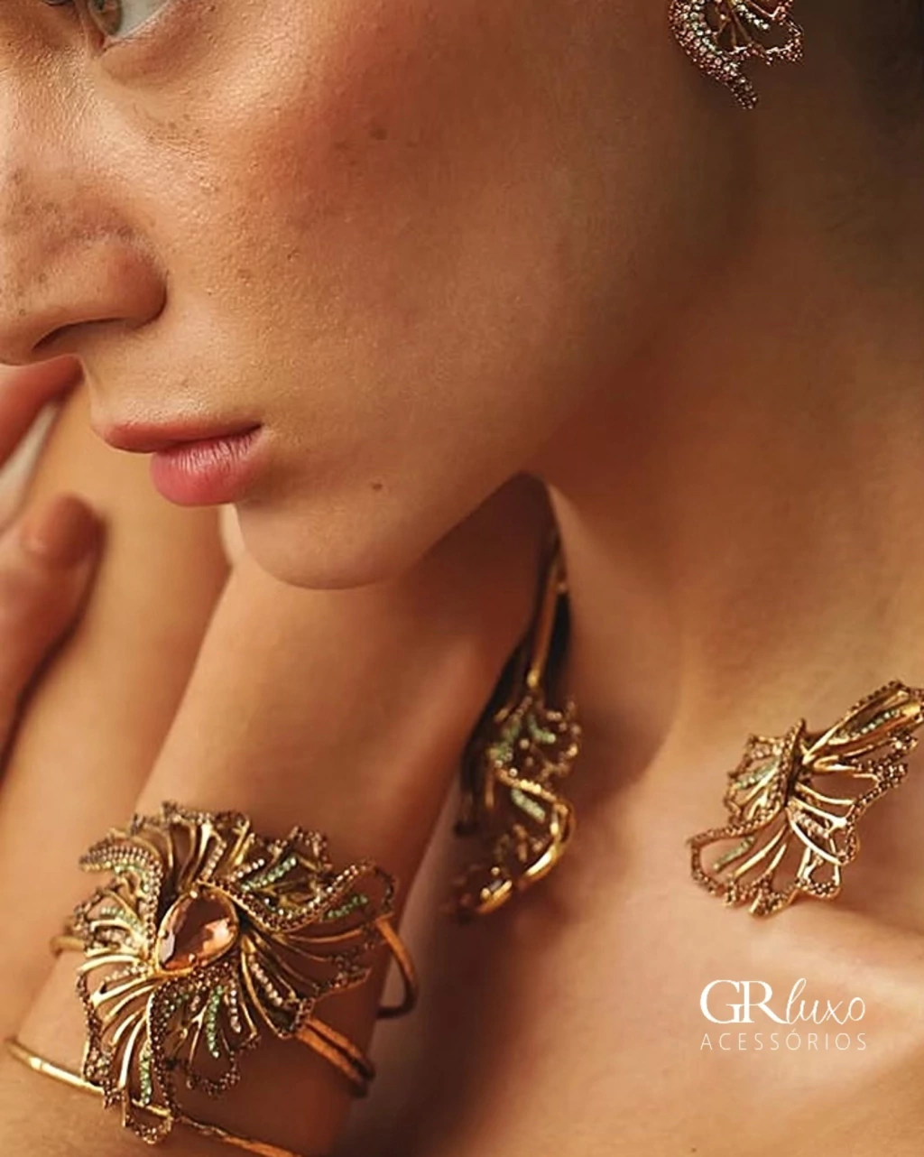 Composição: vários tipos de cristais e finalizado em metal em banho ouro vintage.