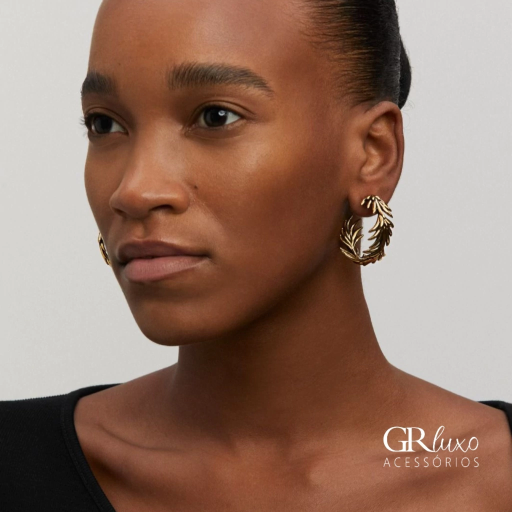 O Brinco Argola Lisa Folhagens foi produzido artesanalmente, aplicando as técnicas da joalheria, no banho Ouro Vintage.