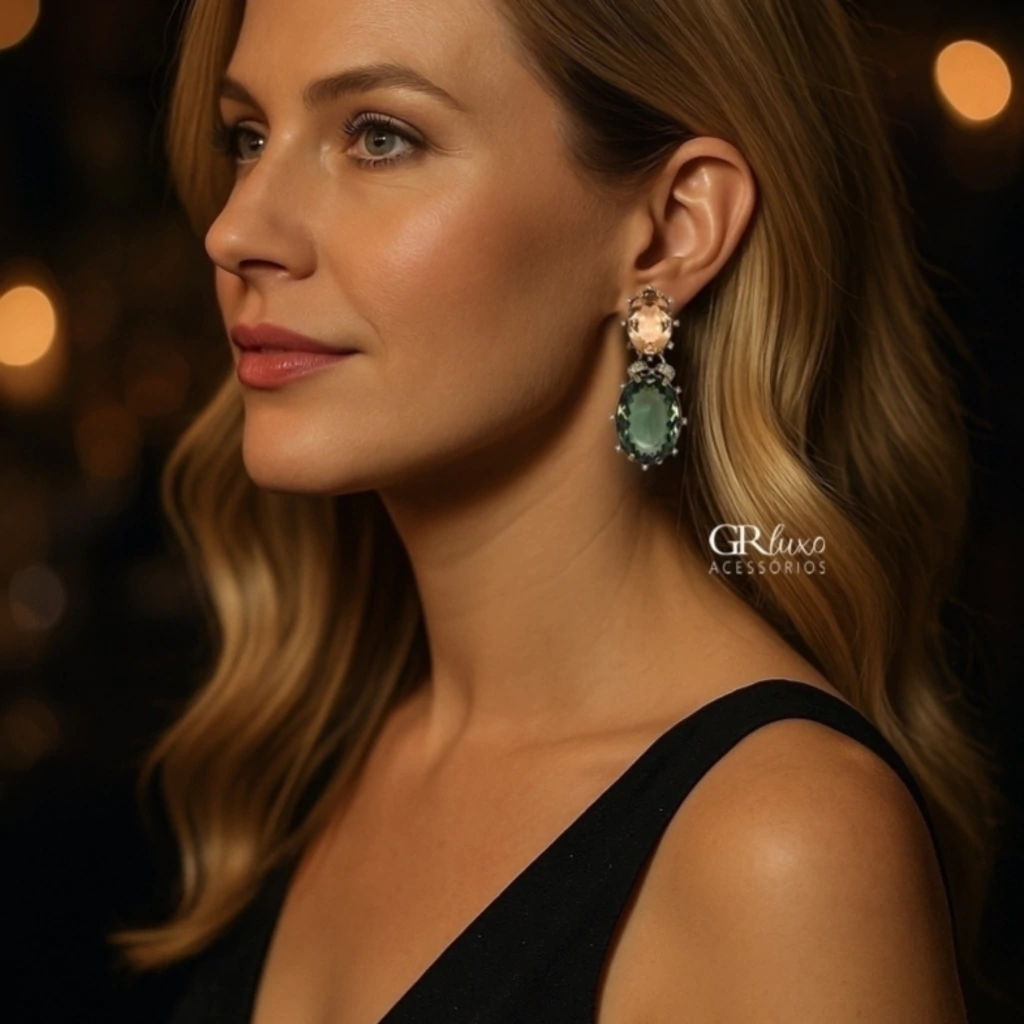 Os detalhes da montagem são tipo cacho, com toques especiais com pingentes, gotas briolet e entremeios com canutilhos de metal em banho ouro velho.