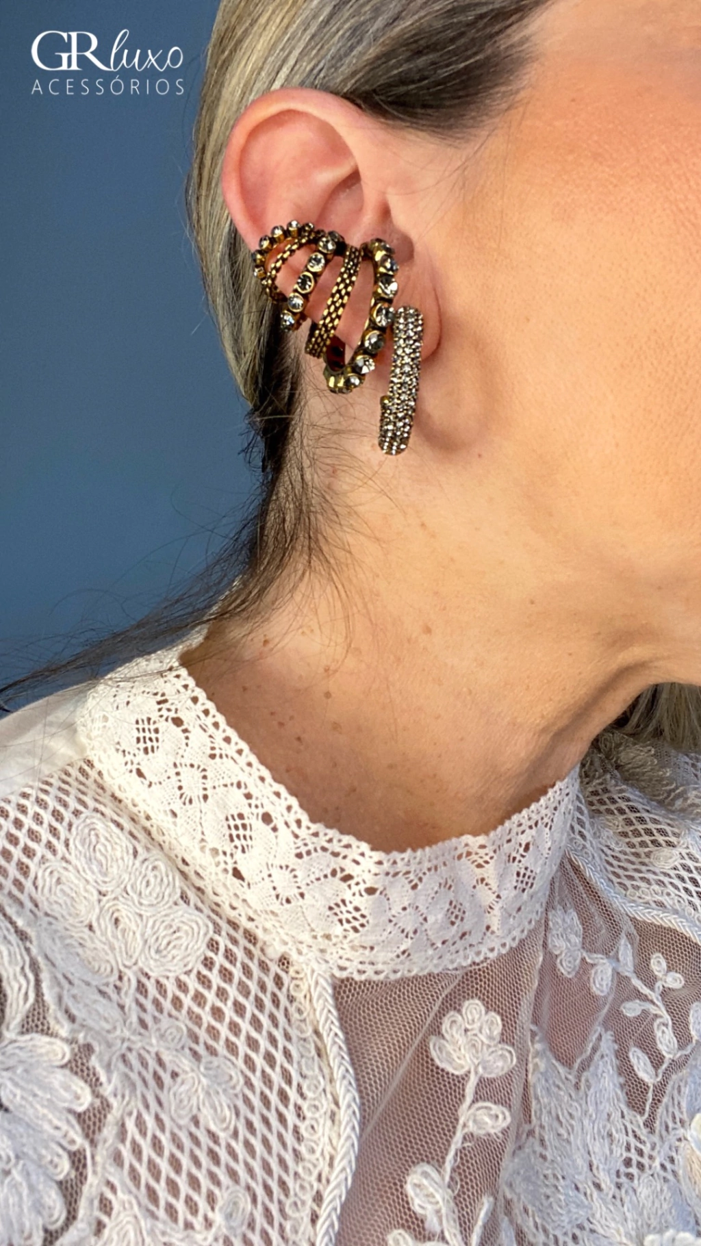 O Ear cuff Ways, no banho ouro vintage, possui aplicação de vários cristais Black Diamond, aplicados manualmente.