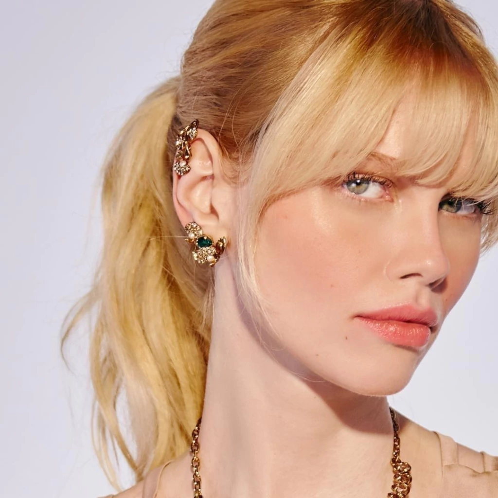 Cada peça carrega a força e a delicadeza dessas flores: os cristais que refletem a luz do Mediterrâneo, as pérolas que remetem ao encontro entre mar e terra, os metais que trazem estrutura e sofisticação, e as pedras naturais, rubi e apatita mescado, que revelam profundidade, intensidade e movimento.