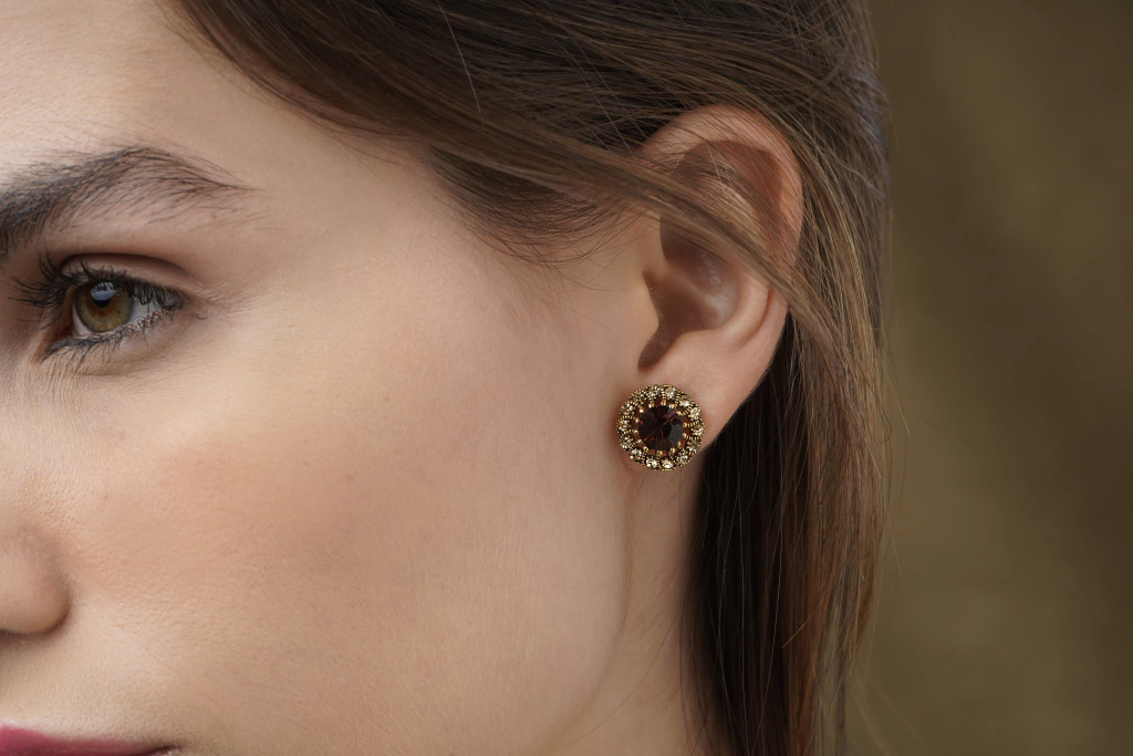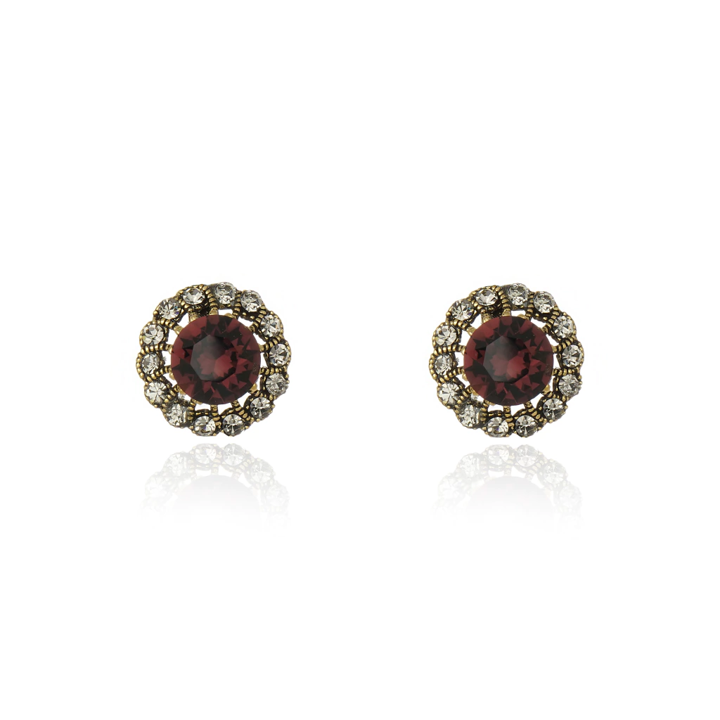 Brinco produzido de forma artesanal com cristal burgundy e em metal em banho Ouro Vintage.