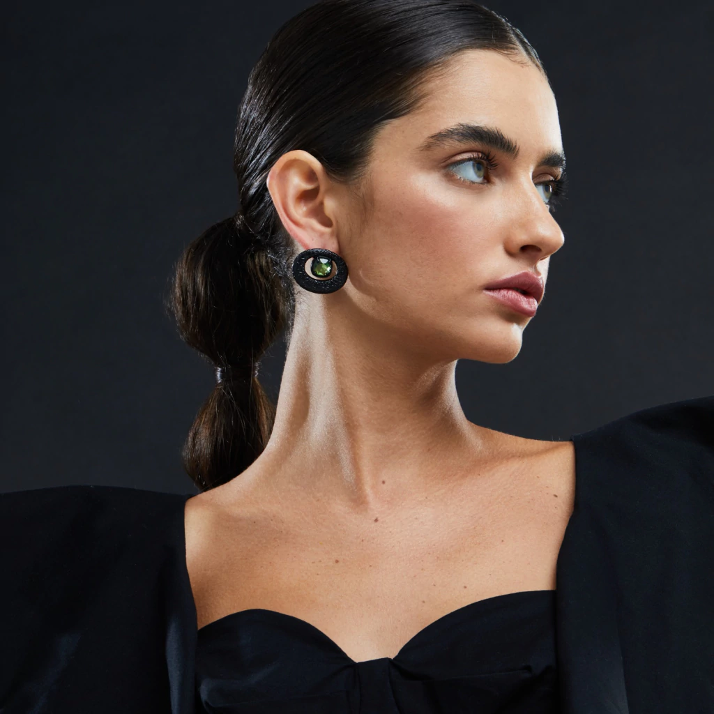 Banhadas em ouro velho, prata velho e verniz preto, se destaca de forma sofisticada a harmonia das nuances dos cristais cravejados.