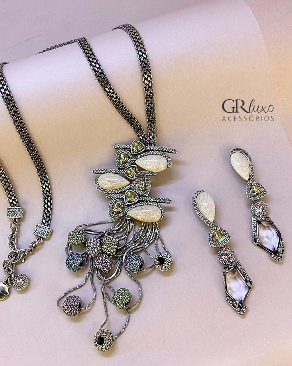 Reedição especial da família Maggie com novas composições de cristais e pedras naturais em formatos pontiagudos, gotas e circulares caracterizam está família, inspirada nas magias da bruxa Maggie Wall, que possui um monumento na Escócia em sua homenagem com uma cruz no topo, pois foi uma poderosa curandeira e marcou seu nome como uma das bruxas mais famosas da história. Com um mix de peças delicadas e outras mais ousadas, representando este marco no universo da magia. No banho ouro velho, cristais coloridos e pedras naturais feldspato e marfim. Peças especiais recebem a pedra natural quartzo rosa com lapidação briolet e rondéis espessos.