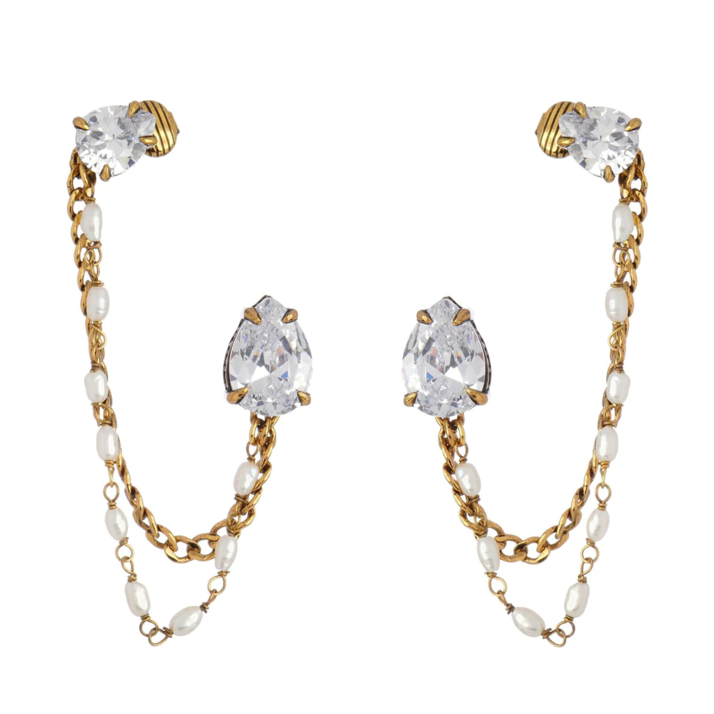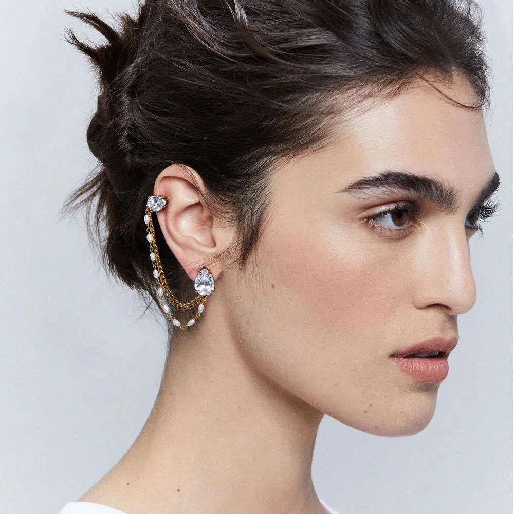Pérolas misturadas à correntaria sugerem um romantismo nada óbvio, acompanhados de zircônias e de esferas cravejadas de cristais que pontuam as peças conectados por laços nos fechos ou no design.