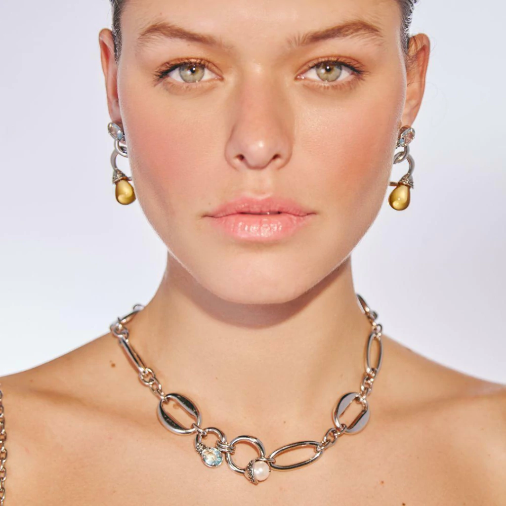 Materiais: Cristais, topaz, pérola e metais com banho em prata velho.