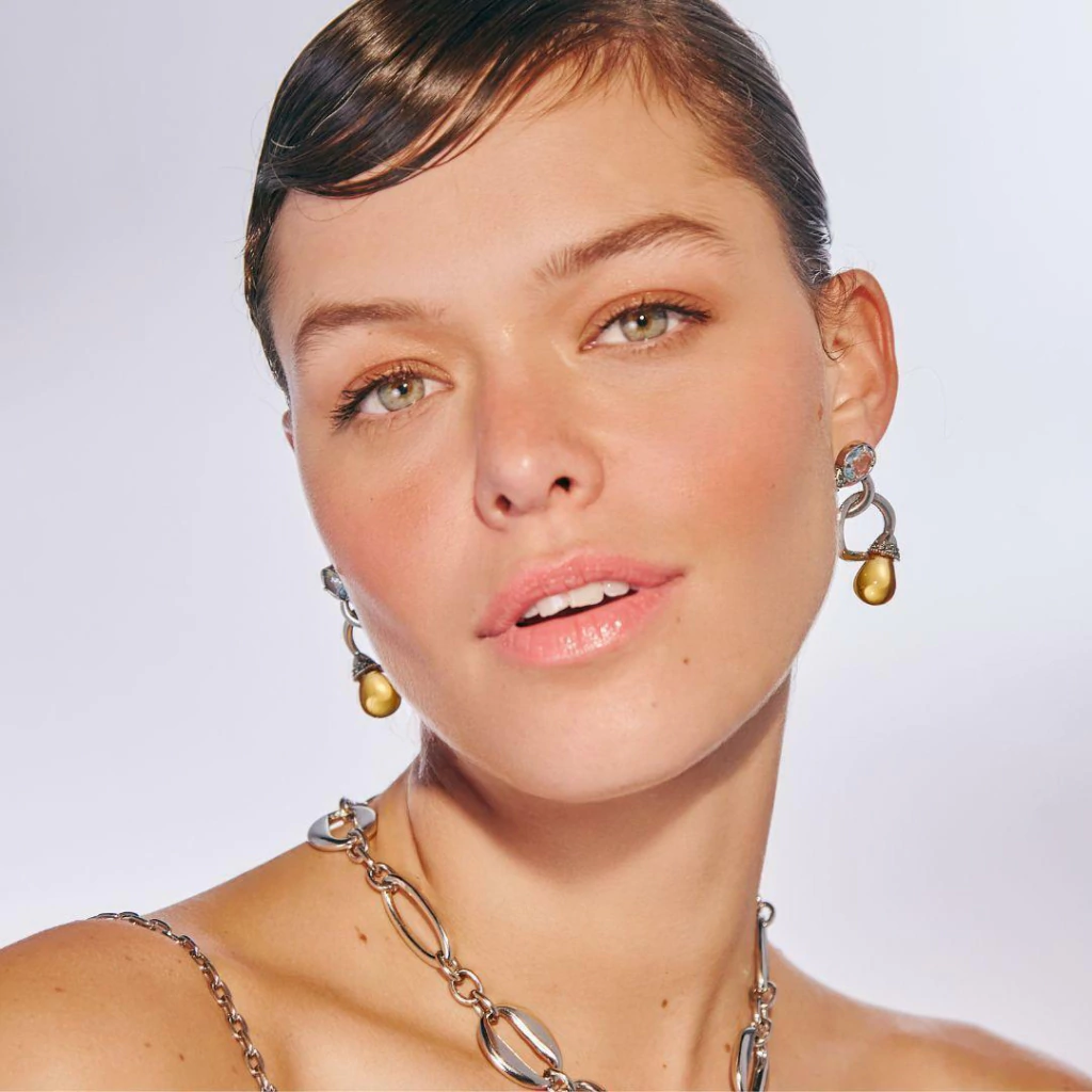 Um encontro entre a energia serena da ametista e a força vibrante do topázio, ambas combinadas à pureza e elegância atemporal das pérolas. Cristais que refletem luz e vida, harmonizados com metais banhados em ouro velho ou prata velha, conferindo um toque clássico e sofisticado à peça.
