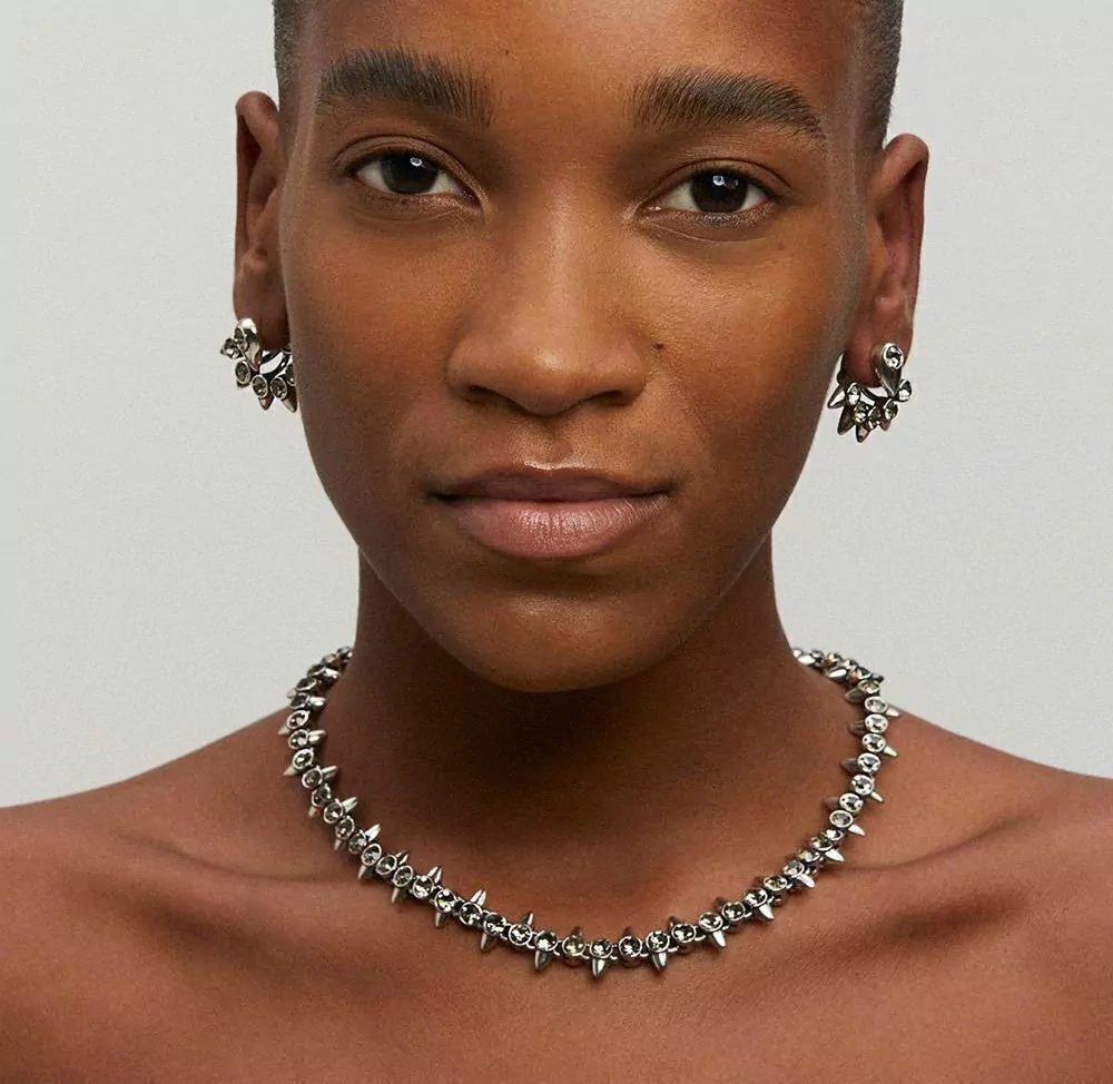 A Choker Duo Strass Sementes foi produzido aplicando as técnicas da alta joalheria, no banho Prata Boho, com cristais cravejados manualmente.