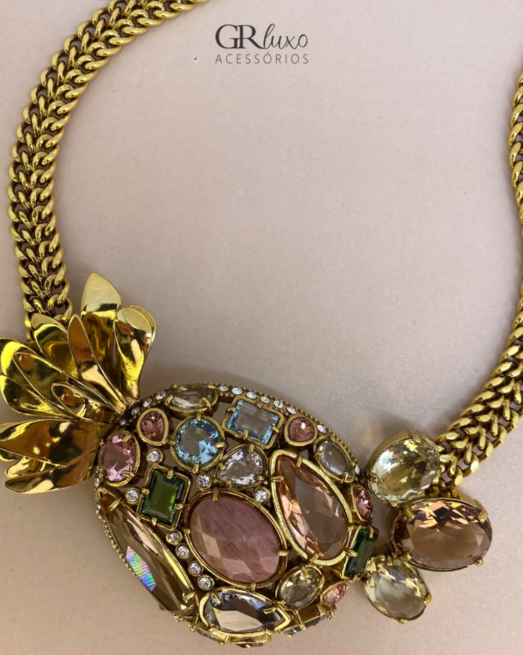 Um design autoral que transita entre o surrealismo e o conceito de alta costura da bijuteria, nasce da designer e artista plástica Camila Klein que se inspirou na simbologia do abacaxi, conhecido como o “Rei das Frutas” e que, desde os primórdios, ficou marcado como símbolo máximo da riqueza e da realeza. A sua coroa volumosa e o seu espírito de celebração fazem jus ao retorno majestoso da linha The Crown – uma linha de peças numeradas com uma curadoria única de pedras e cristais, criada para aquelas que irradiam a riqueza de sua alma para os que habitam o seu reino.
