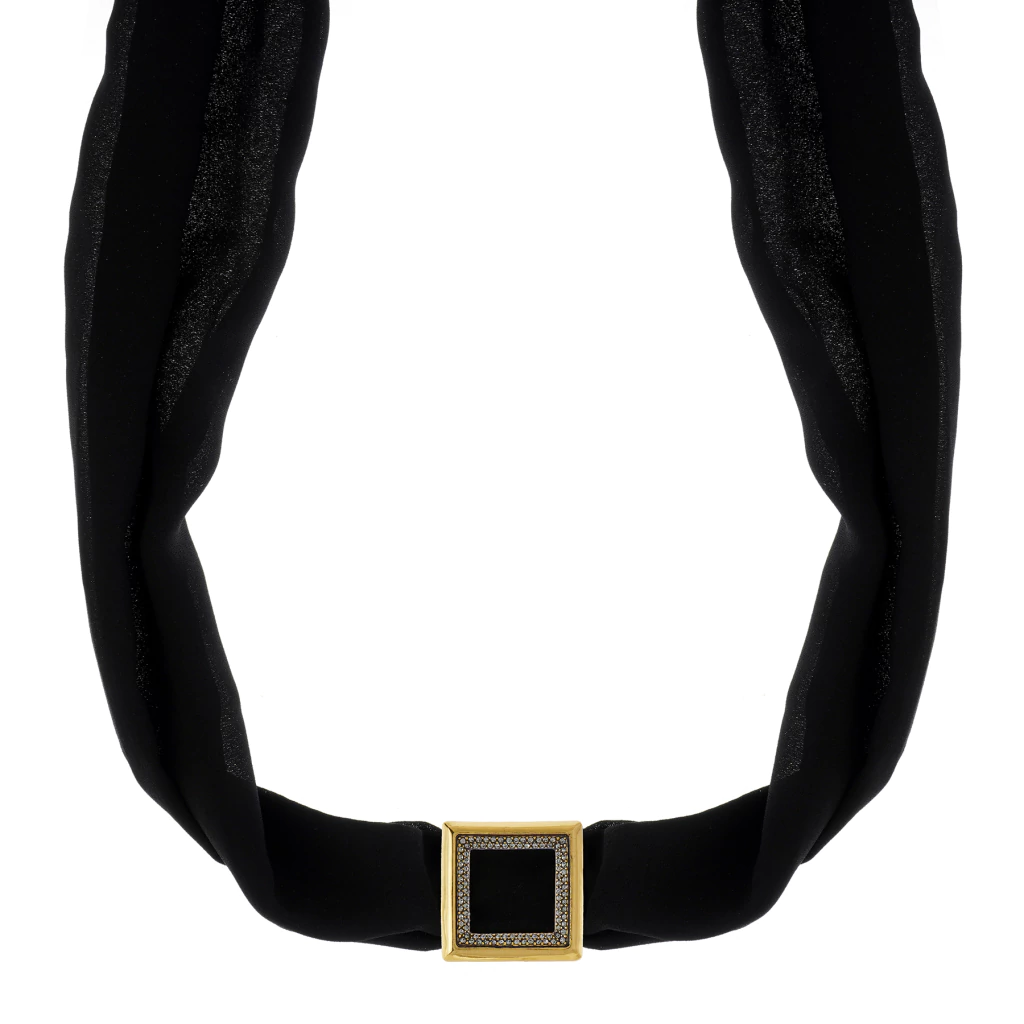 O Colar Conceito Antares foi produzido artesanalmente, aplicando as técnicas da joalheria, no banho Ouro Vintage, com cristais cravejados manualmente, e faixa lenço de crepe de seda. Outras formas surpreendentes de uso: Choker, Pulseira, Cinto ou Headband.