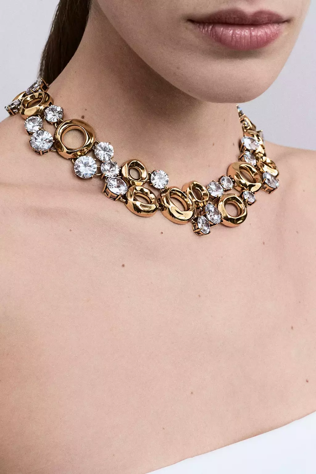 O Colar Conceito Mar foi produzido artesanalmente, aplicando as técnicas da joalheria, no banho Ouro Vintage, com cristais cravejados manualmente.