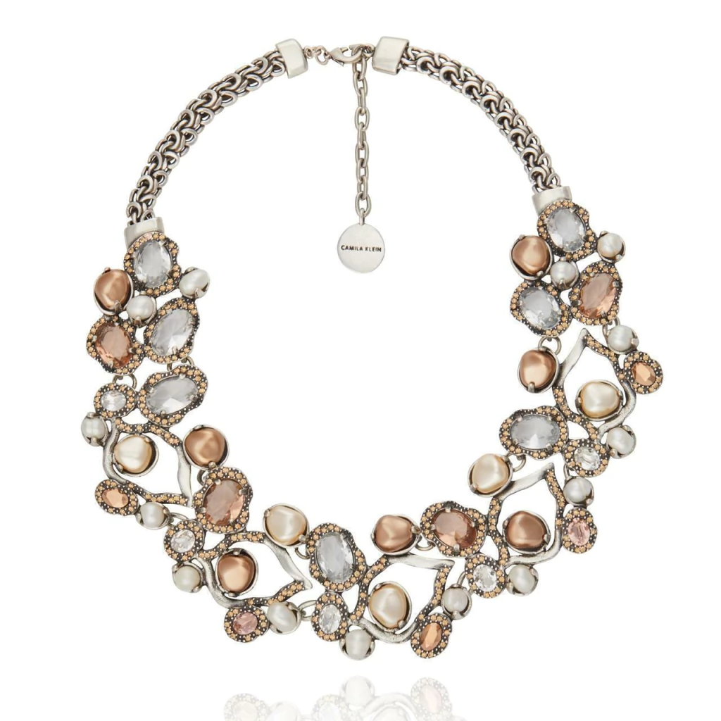 Cristais em tons de roxo, rosé e cinza se unem a pérolas brancas e aos banhos ouro velho e prata velho, criando composições sofisticadas que combinam textura, brilho e elegância atemporal.