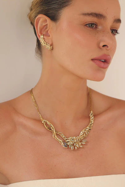 Os brincos e colares, com suas formas fluídas e leves, evocam o movimento das penas ao vento, enquanto os anéis trazem uma explosão de brilho, como se cada pedra fosse uma estrela a brilhar em seu próprio céu.