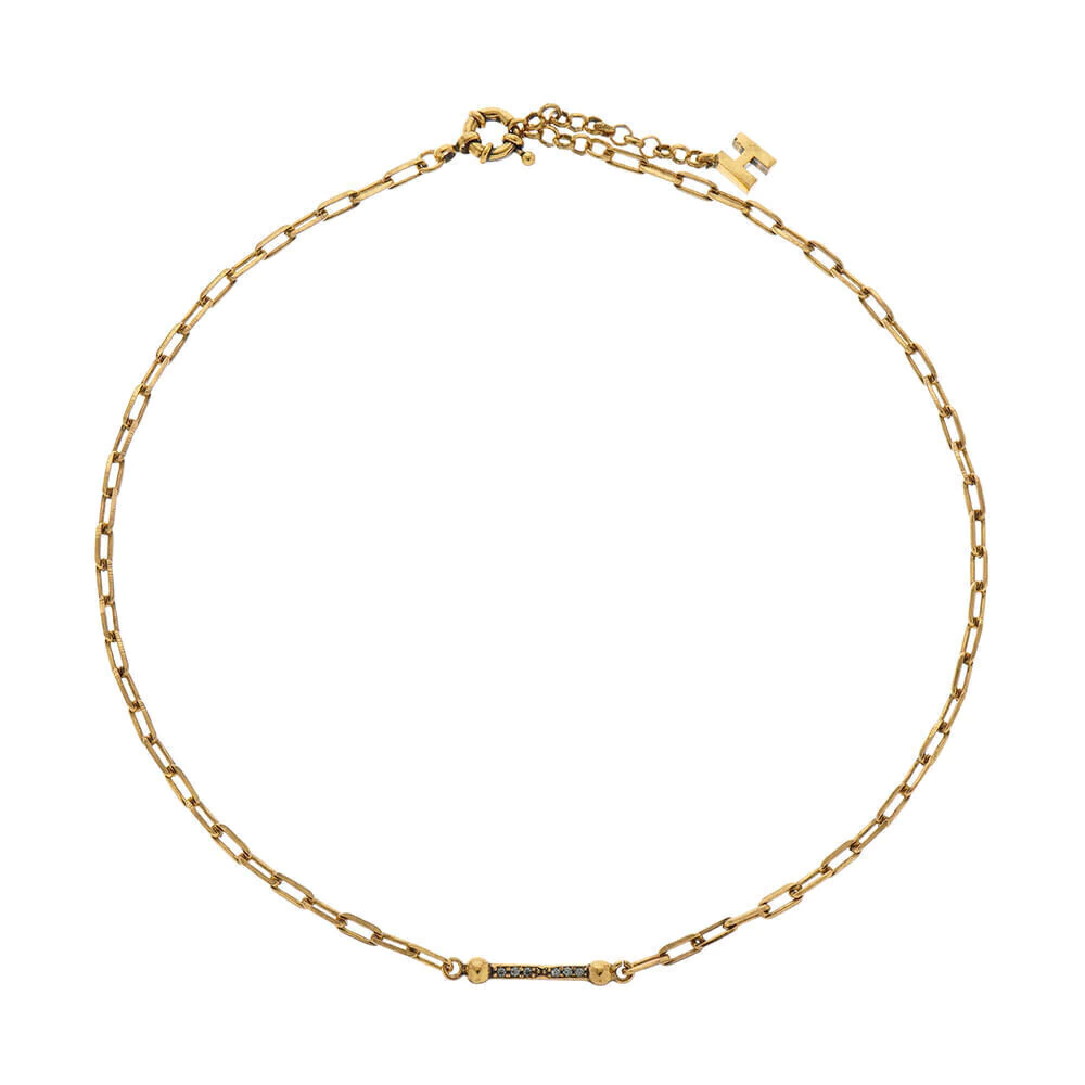 O Colar Mini Essência foi produzido artesanalmente, no banho ouro vintage, com cristais black diamond, aplicados manualmente.