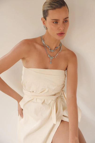 Os brincos e colares, com suas formas fluídas e leves, evocam o movimento das penas ao vento, enquanto os anéis trazem uma explosão de brilho, como se cada pedra fosse uma estrela a brilhar em seu próprio céu.