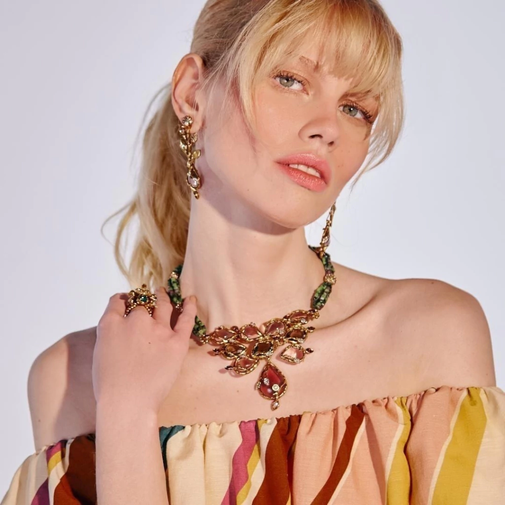 Cada peça carrega a força e a delicadeza dessas flores: os cristais que refletem a luz do Mediterrâneo, as pérolas que remetem ao encontro entre mar e terra, os metais que trazem estrutura e sofisticação, e as pedras naturais, rubi e apatita mescado, que revelam profundidade, intensidade e movimento.