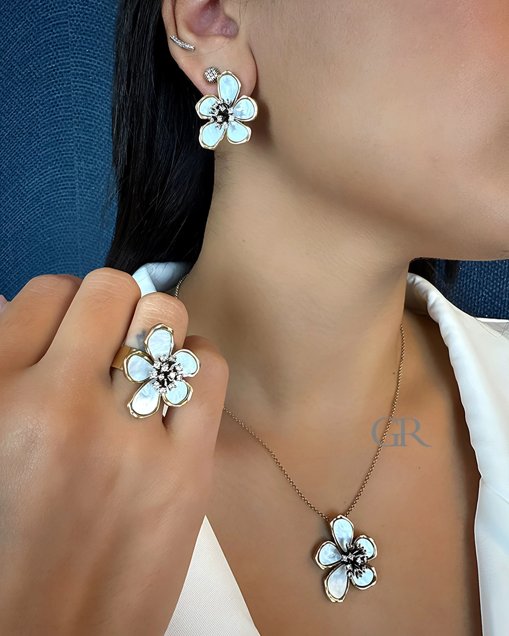 Seu design autoral e multifacetado dá vida a coleções atemporais compostas por brincos, colares, braceletes, anéis, tiaras e broches — todos desenvolvidos com metais nobres e acabamento em banho ouro 18K ou ouro/prata vintage.