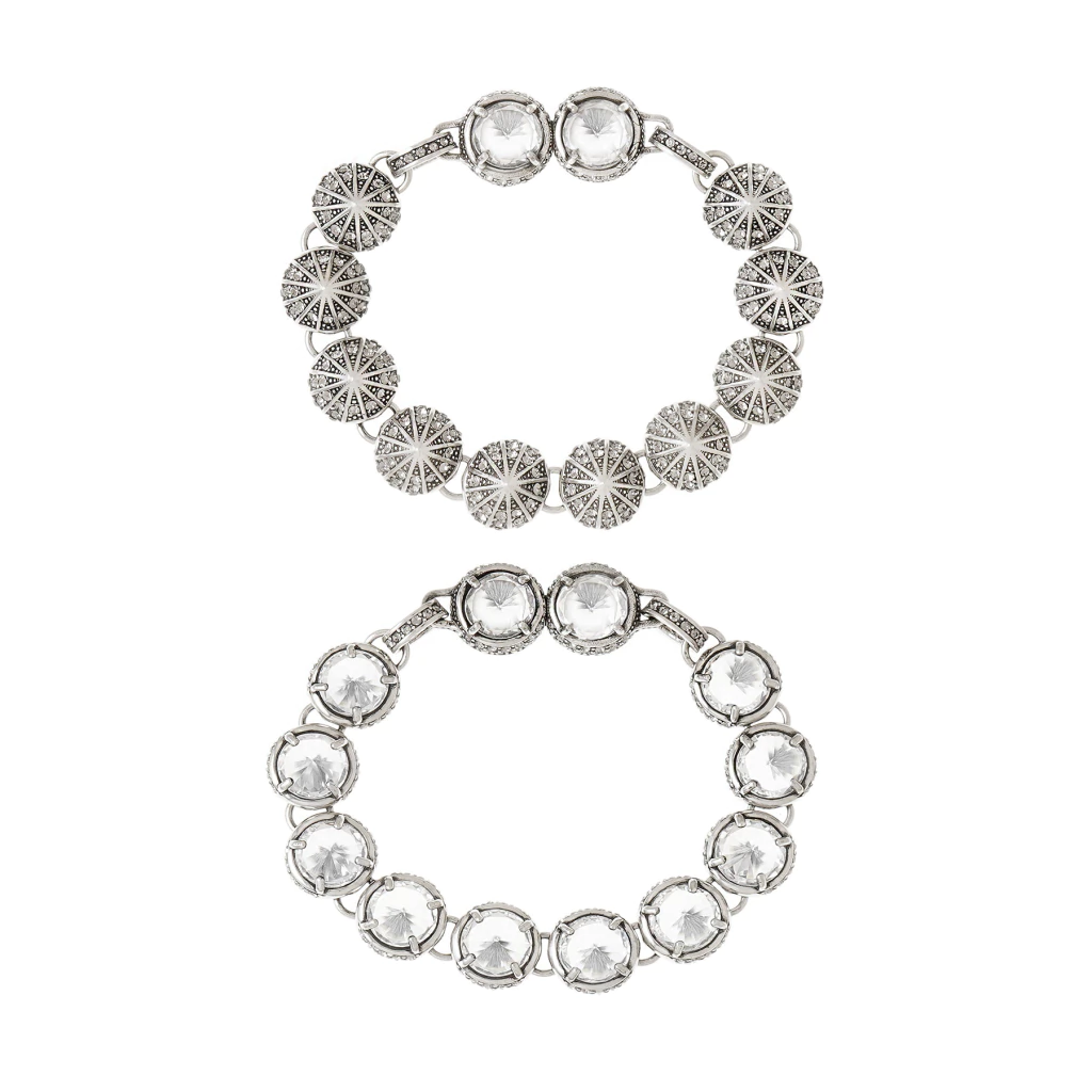O Kit de Pulseiras Spike Órion foi produzido artesanalmente, aplicando as técnicas da joalheria, no banho Prata Boho, com cristais cravejados manualmente.