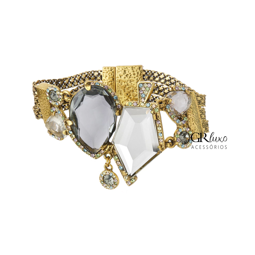 Reedição especial da família Maggie com novas composições de cristais e pedras naturais em formatos pontiagudos, gotas e circulares caracterizam esta família, inspirada nas magias da bruxa Maggie Wall, que possui um monumento na Escócia em sua homenagem com uma cruz no topo, pois foi uma poderosa curandeira e marcou seu nome como uma das bruxas mais famosas da história. Com um mix de peças delicadas e outras mais ousadas, representando este marco no universo da magia. No banho ouro velho, cristais coloridos e pedras naturais feldspato e marfim. Peças especiais recebem a pedra natural quartzo rosa com lapidação briolet e rondéis espessos.