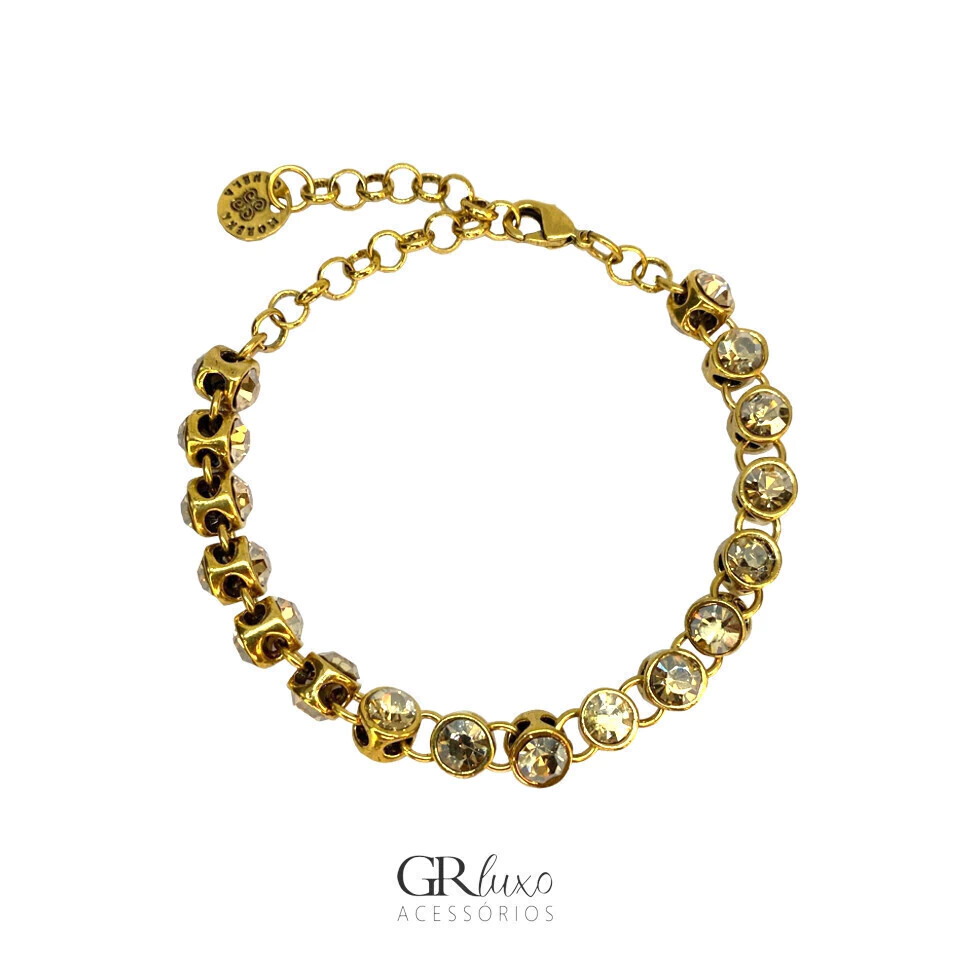 Pulseira produzida de forma artesanal com aplicação de cristais austríacos, finalizado em metal em banho ouro velho.