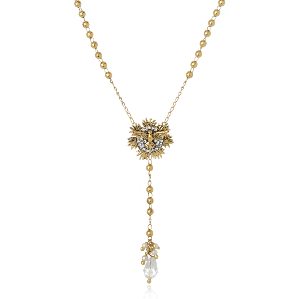Colar produzido de forma artesanal com cristais e pérola em metal em banho ouro velho.