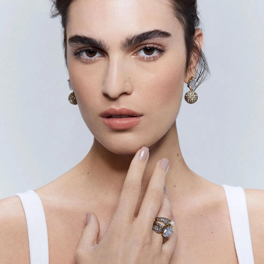 Pérolas misturadas à correntaria sugerem um romantismo nada óbvio, acompanhados de zircônias e de esferas cravejadas de cristais que pontuam as peças conectados por laços nos fechos ou no design.